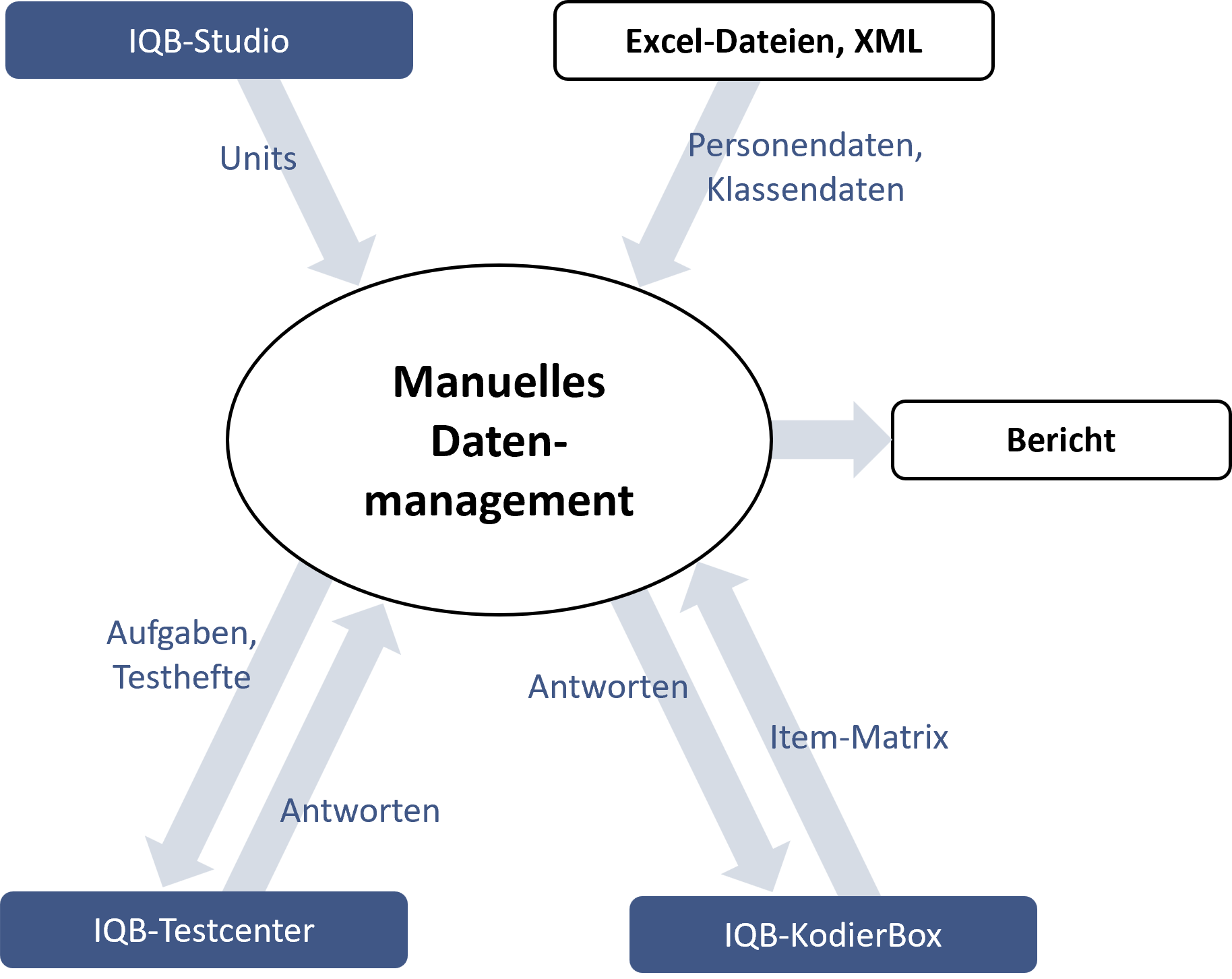 - IQB-Testcenter: Diese Software führt den Test durch. Dazu sind Aufgaben (Units) und deren Anordnung im Test (Booklets) sowie die Personenlisten erforderlich. Die Antworten werden nach dem Test durch das Management-Portal abgerufen.