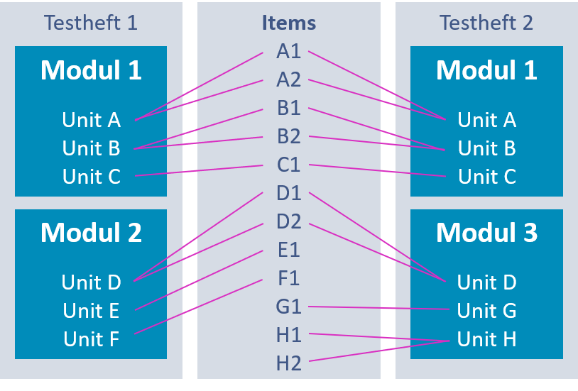 Dieselbe Unit kann in verschiedene Blöcke eingefügt werden – man muss dann halt nur darauf achten, dass die Blöcke entsprechend eingesetzt werden (“Unverträglichkeit”). Es gibt aber auch Units, die bewusst mehrfach im selben Testheft eingesetzt werden, z. B. Fragen zur Motivation.