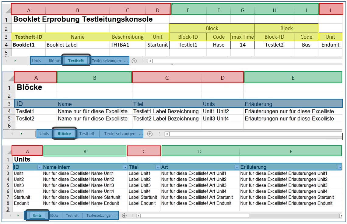 - blau: Die textuellen Inhalte können geändert werden. itc-Toolbox findet die entsprechenden für die XML-Dateien benötigten Inhalte. Um die Excel-Dateien einheitlich zu halten, wird jedoch von einer Umbenennung abgeraten.