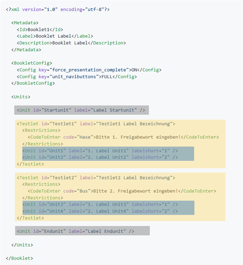 Die Struktur eines Testheftes am IQB ist recht einheitlich: Aufgaben werden in Blöcke platziert, und Testhefte werden aus diesen Blöcken zusammengesetzt. Blöcke und damit Aufgaben können in mehreren Testheften vorkommen, um z. B. Positionseffekte während einer Pilotierung zu untersuchen. Zeitbeschränkungen sowie Ablaufsynchronisation werden auf Blockebene definiert.
