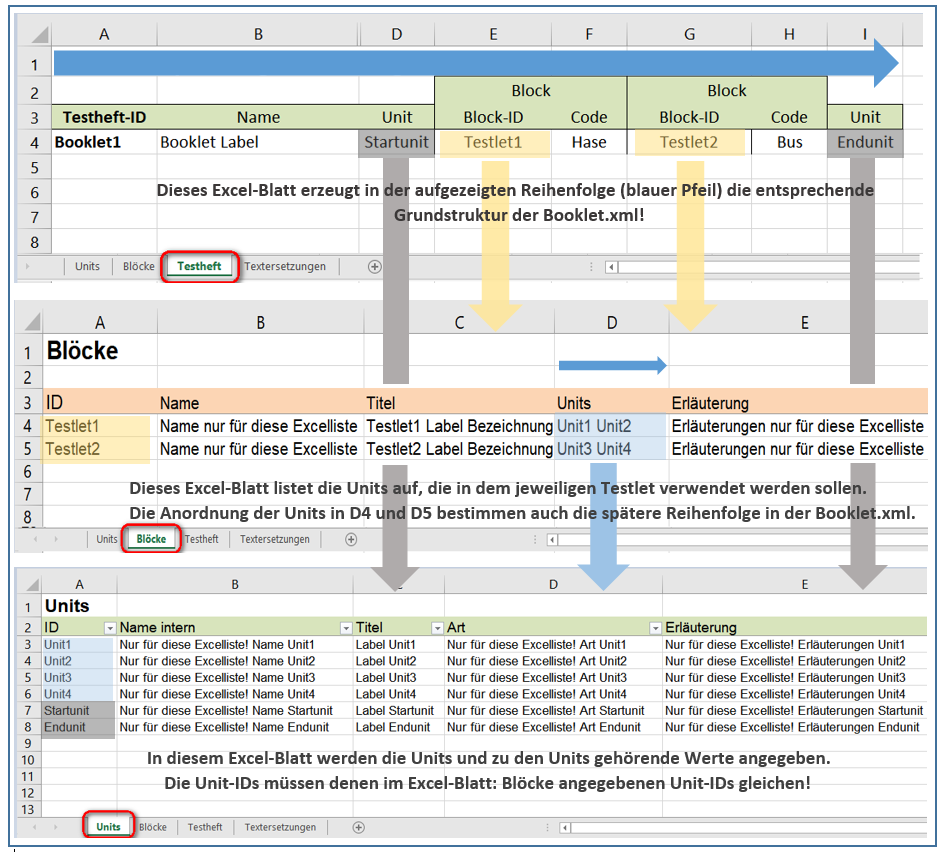 Die Funktion “Booklet-Xlsx” der itc-ToolBox liest zunächst eine vorbereitete Excel-Datei ein. Hier sind alle nötigen Informationen für die Testhefte in einer Art hinterlegt, die gut lesbar und kommunizierbar ist. Spezielle Markierungen innerhalb der Datei stellen sicher, dass die itc-ToolBox die Informationen findet. In einem zweiten Schritt erzeugt die itc-ToolBox Xml-Dateien für jedes gefundene Testheft.