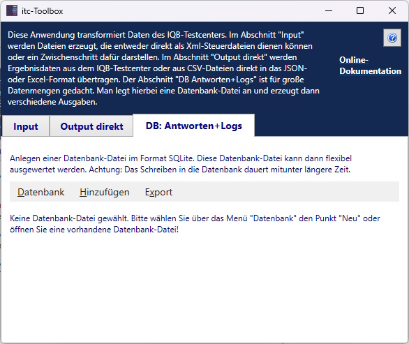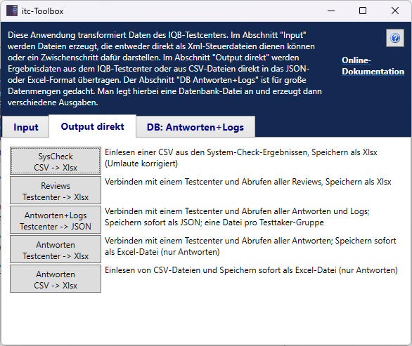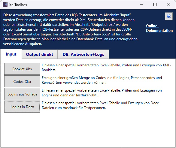 Dazu gehört das Windows-Programm itc-ToolBox. Es kann ohne Adminrechte über die Website des IQB (s. o.) installiert werden. Die Programmierung ist als Open Souce hier veröffentlicht und kann aufgrund der freien Nutzungslizenz angepasst werden (Visual Basic .NET).