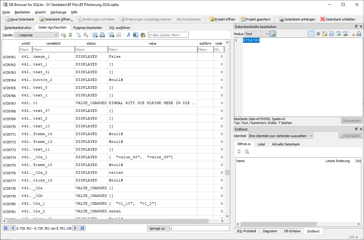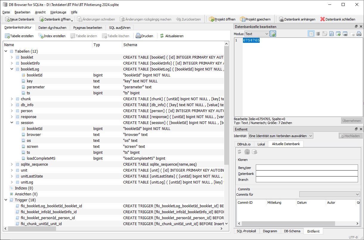 Für große Datenmengen kann man eine Datenbank benutzen. Es handelt sich um eine Datei, die man lokal speichert. Die ToolBox nutzt hierzu SQLite. Die Daten verbrauchen dann weniger Speicherplatz als JSON und man kann mit anderen Tools auf diese Daten zugreifen und flexibel auswerten. Unten ist als Beispiel der kostenlose DB Browser for SQLite abgebildet.