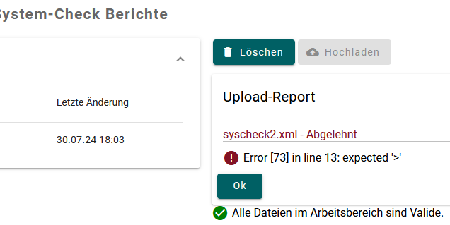 Das Hochladen ist nur erfolgreich, wenn es sich um eine gültige System-Check-Konfiguration handelt. Sollte sich beim Editieren ein Fehler eingeschlichen haben, versucht das Testcenter mit einer Fehlermeldung zu helfen:
