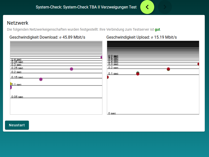 Ist die Bandbreite zu gering, kann im schlimmsten Fall die Testung am jeweiligen PC nicht durchgeführt werden. Die Interpretation der Netzwerkverbindung ist allerdings sehr unsicher. Man ist ja in der Durchführung nicht nur vom Computer abhängig, auf dem der Check läuft, sondern auch von der Last, die gerade durch andere Computer verursacht wird. Das kann dieselbe Testung sein, aber auch eine ungeplante Systemaktualisierung irgendwo anders im Haus, das einen umfangreichen Download auslöst.
