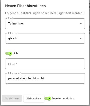 Es ist möglich mithilfe der -Schaltfläche weitere individuelle Filter einzurichten. Im erweiterten Modus kann auf regulärer Ausdrücke gefiltert werden. Im Standard-Modus kann auf “gleich” und “enthält” gefiltert werden. Wird ein adaptives Testheft verwendet, kann auf die dort hinterlegten State-Elemente und auf die zugehörigen Options-Elemente gefiltert werden.