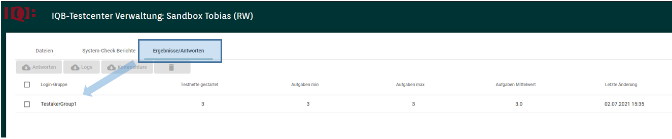 Um die Daten aus einer Studie oder einer Befragung zu erhalten, meldet man sich am Testcenter mit Admin-Rechten an und geht im betreffenden Arbeitsbereich auf den Tab “Ergebnisse/Antworten”: