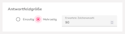 Unter „Mehrzeilig“ können Sie die Anzahl der Zeilen des Antwortfeldes abhängig von der erwarteten Zeichenanzahl festlegen. Die Zeichenanzahl definiert den optischen Platz des Feldes und die Höhe passt sich entsprechend an. Die Breite entspricht dabei immer einem einzeiligen langen Antwortfeld (<12 Wörter).