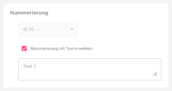 Sie können verschiedene Nummerierungen für die Antwortfelder auswählen. Zusätzlich können Sie durch Setzen des Häkchens „Nummerierung mit Text erweitern“ einen gewünschten Text neben der Nummerierung einstellen, welcher über dem jeweiligen Antwortfeld erscheint. Für jedes Antwortfeld kann ein eigener Text hinterlegt werden.