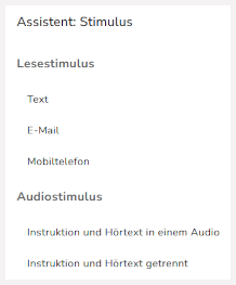 Diese Stimuli dienen dazu, unterschiedliche Inhalte wie Texte, E-Mails, SMS oder Audios darzustellen und so verschiedene Lese- oder Hörsituationen abzubilden. Wählen Sie das für Ihre Aufgabe passende Stimulusformat und Sie werden zum entsprechenden Assistenten weitergeleitet.