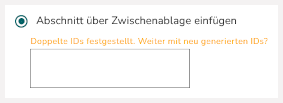 In diesem Fall werden automatisch neue IDs durch das Studio vergeben. Es ist allerdings sinnvoll nach dem Einfügen und vor dem nächsten Speichervorgang des Studios zu überprüfen, ob wirklich neue IDs erstellt wurden, da es bei dem Einfügen zu Fehlern kommen kann und die Aufgabe bei doppelten IDs nicht mehr bearbeitbar ist. Nutzen Sie dazu die Elementlisten der Abschnitte.