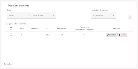 Die Element liste zeigt Ihnen alle Elemente in der gesamten Unit an. Sie können dort Elemente löschen, IDs verändern und übergreifend Einstellungen ändern, wie z.B. „Presentation Complete“ (für mehr Informationen dazu s. hier)