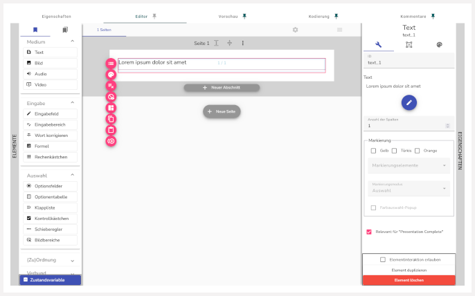 Zusätzlich zu den Einstellungen, die bei allen Elementen zu finden sind, gibt es eine Vielzahl von Einstellungen für spezifische Elemente. Beispielsweise können Sie bei Audios einstellen, wie oft diese abgespielt werden können, bei Textfeldern können Sie begrenzen, wie viele Zeichen eingegeben werden können und bei Drag&Drop Aufgaben können Sie genau einstellen, von wo nach wo sich Objekte ziehen lassen. Dies und vieles Weiteres finden Sie hier beschrieben: Link