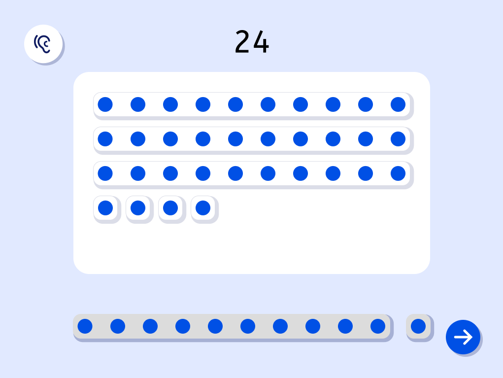Bei diesem Interaktionstyp legt die Testperson eine Zahl mit Hilfe von 10er-Riegeln und 1er-Plättchen auf einer Stellenwerttafel. Die Testperson klickt bzw. tippt auf einen 10er-Riegel oder ein 1er-Plättchen und verschiebt dieses dadurch auf die Ablagefläche bzw. entfernt es. Auf der Ablagefläche werden die Elemente automatisch sortiert und ausgerichtet.